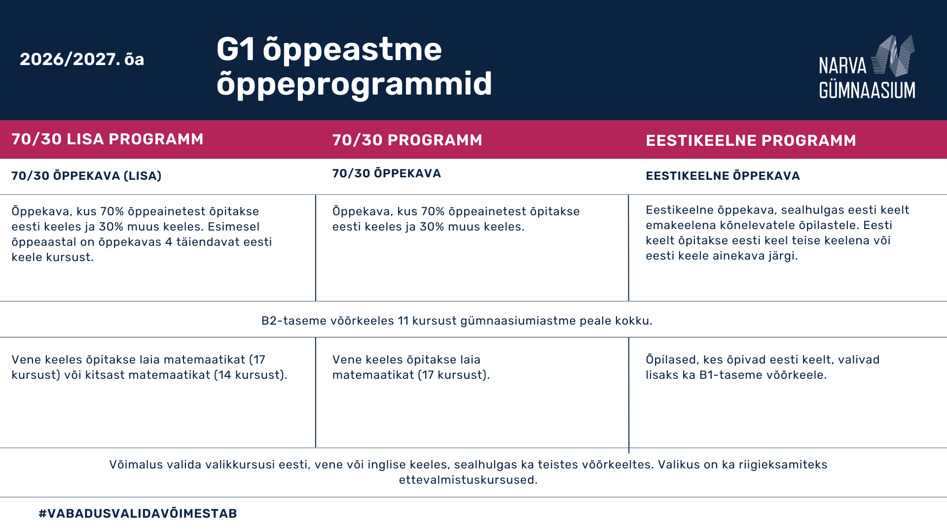 G1 õppeastmesse ehk 10. klassi sisseastudes saab õpilane valida endale õppeprogrammi.