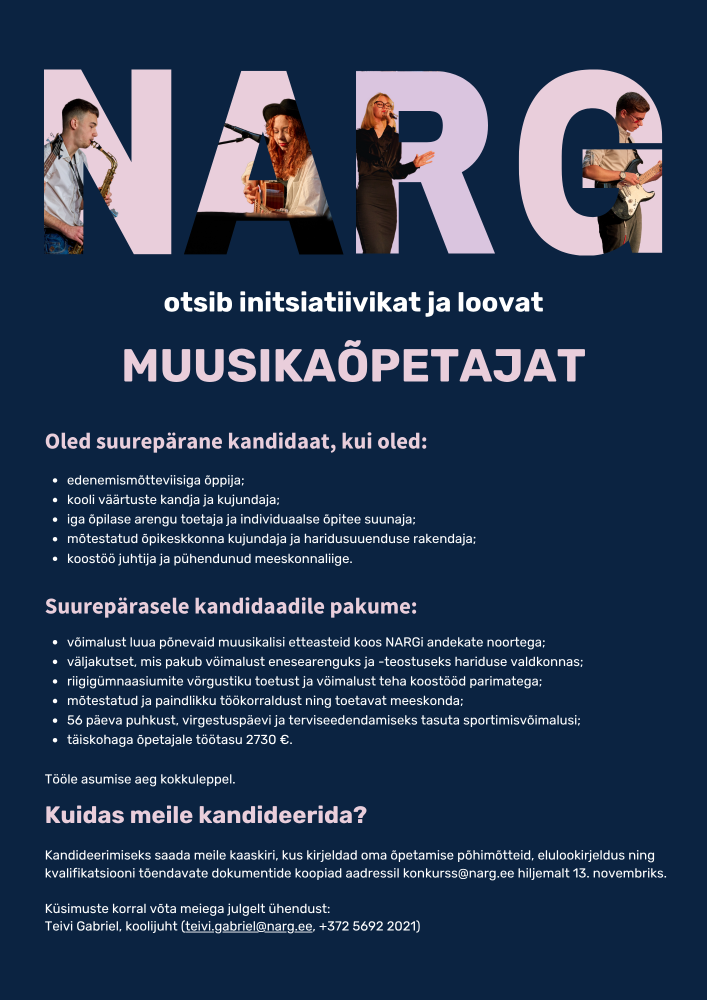 Otsime 2025/2026 õppeaastaks meeskonnaga ühinema täiskoormusega muusikaõpetajat.