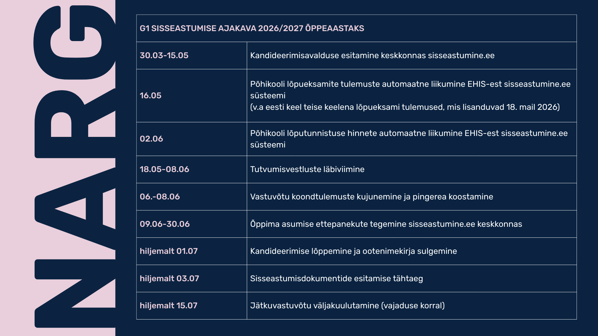 2026/2027. õppeaasta G1 vastuvõtuperiood algab 30. märtsil 2026. Avalduste esitamine toimub sisseastumise infosüsteemis sisseastumine.ee.